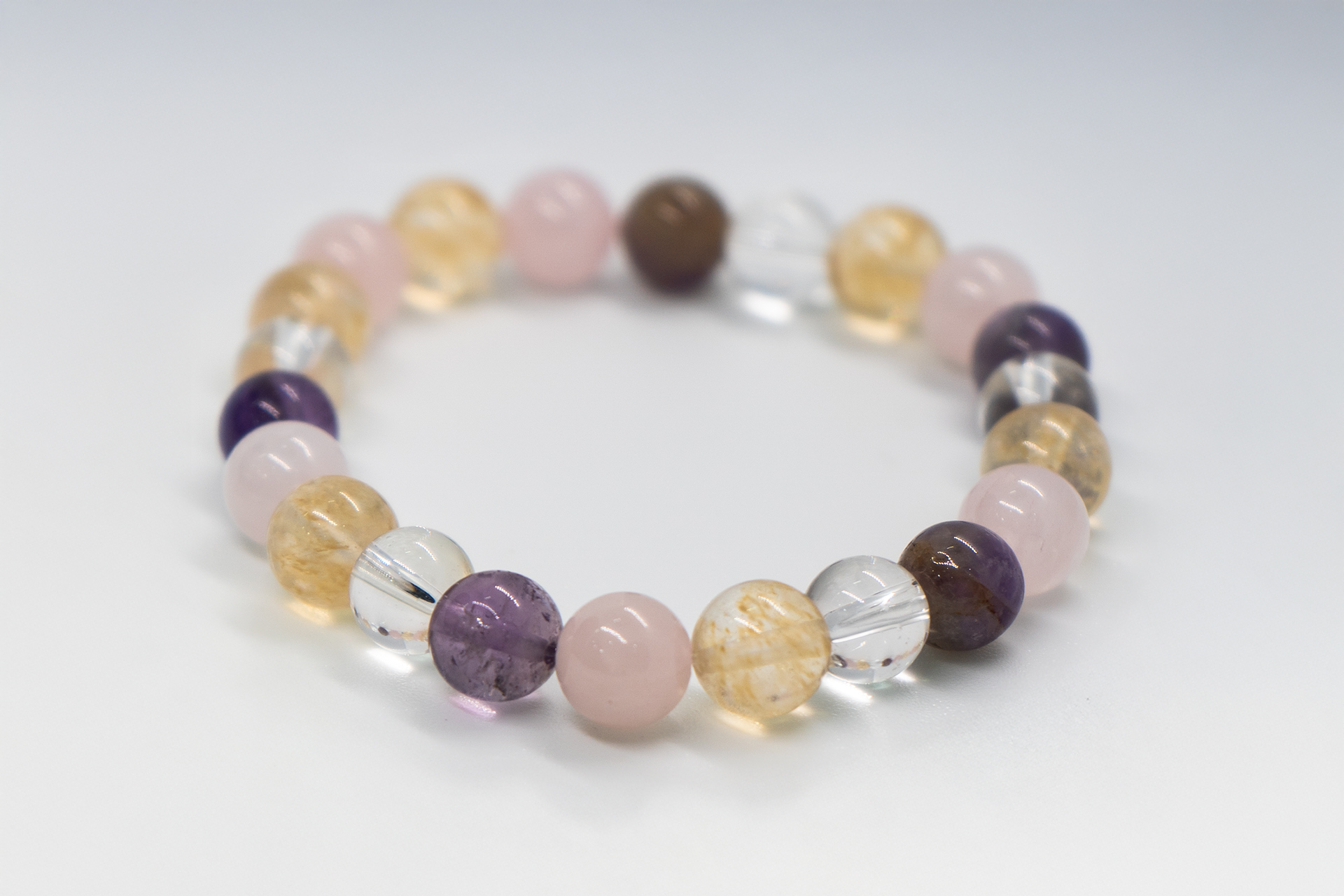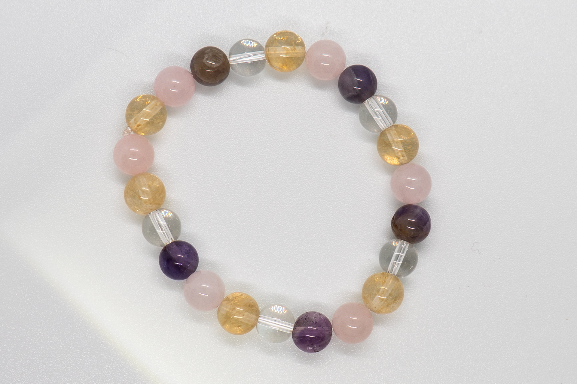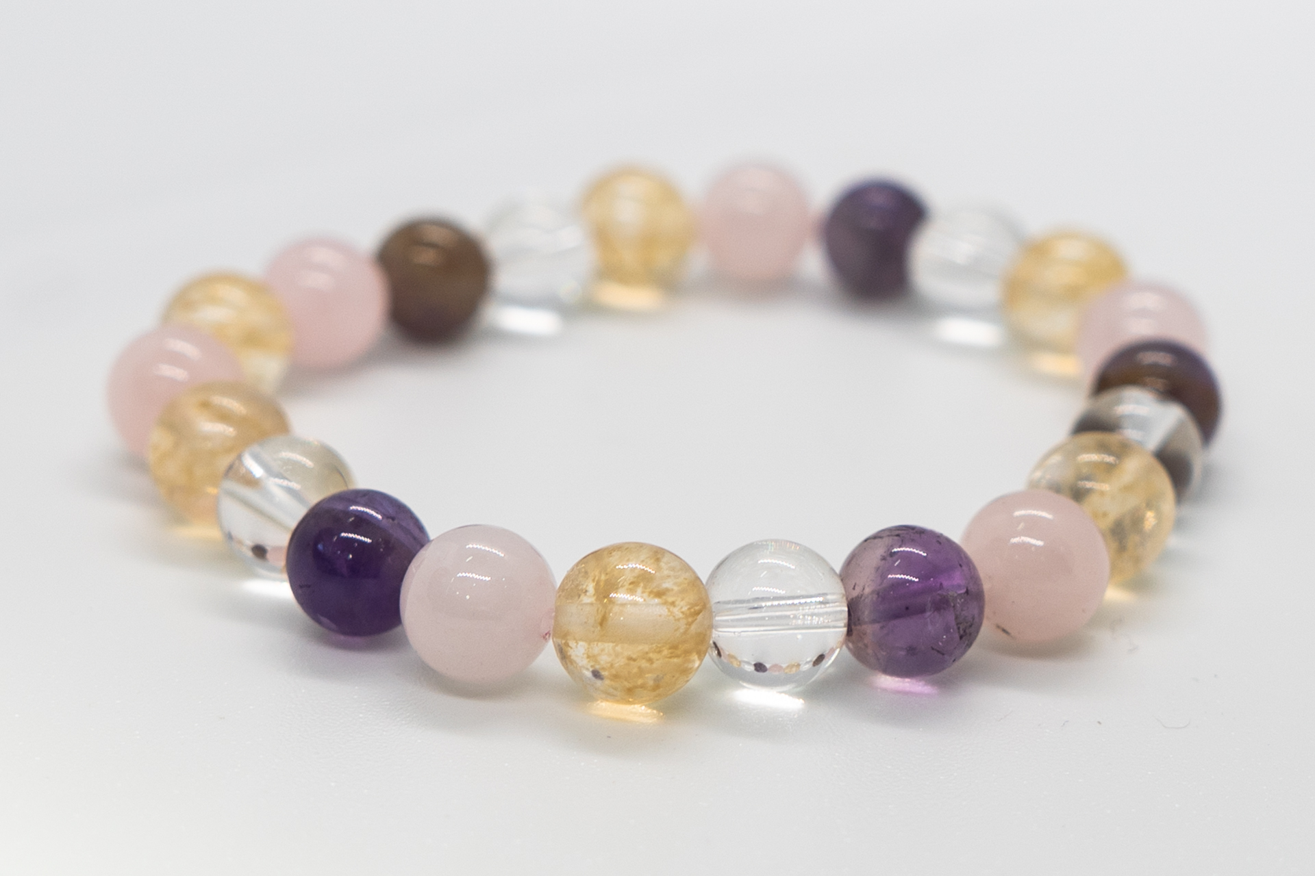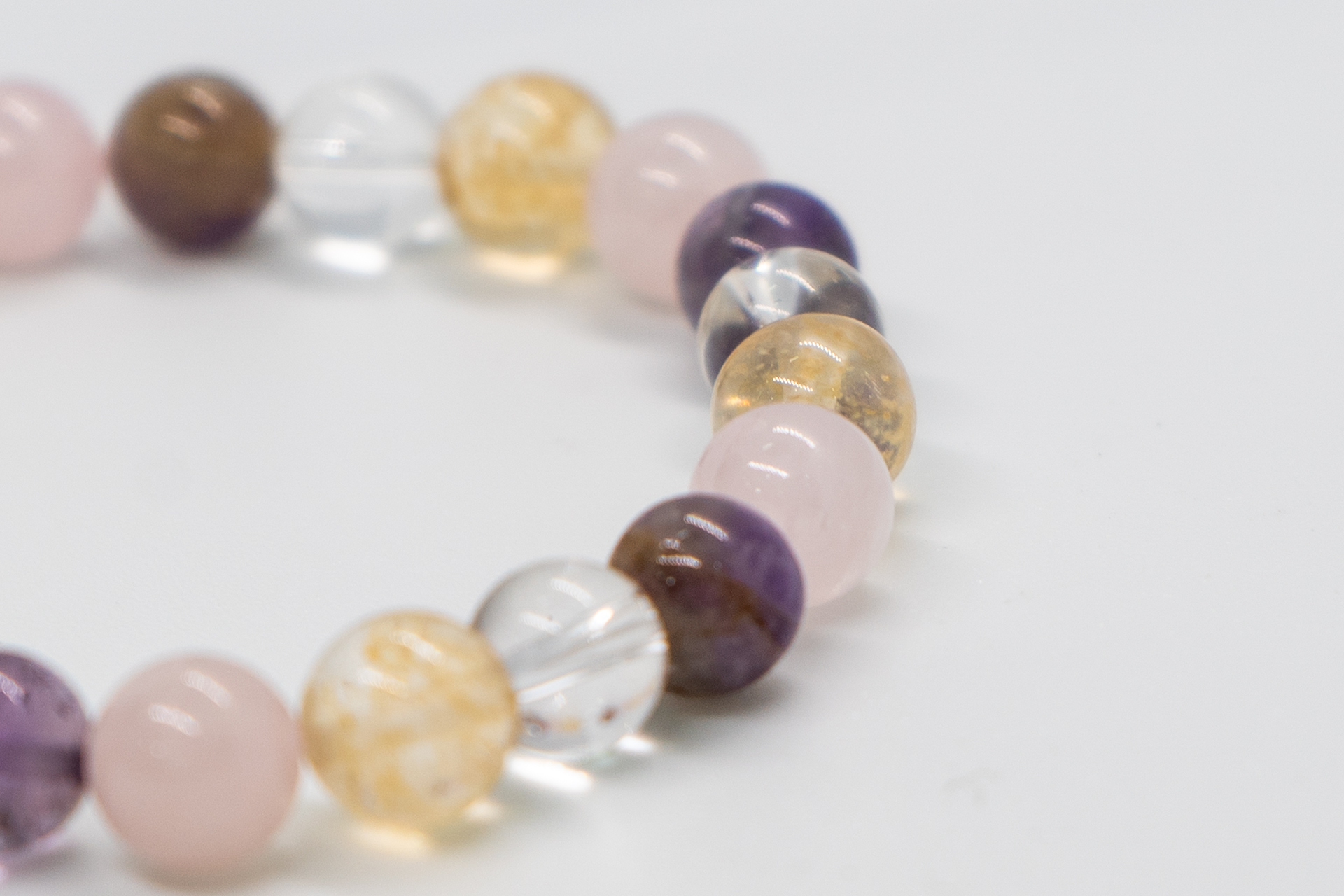 Esta hermosa pulsera artesanal combina la energía y belleza de cuatro piedras naturales: amatista, que aporta calma y protección; citrino, símbolo de abundancia y alegría; cuarzo blanco, conocido por su poder limpiador y amplificador; y cuarzo rosa, la piedra del amor y la armonía.