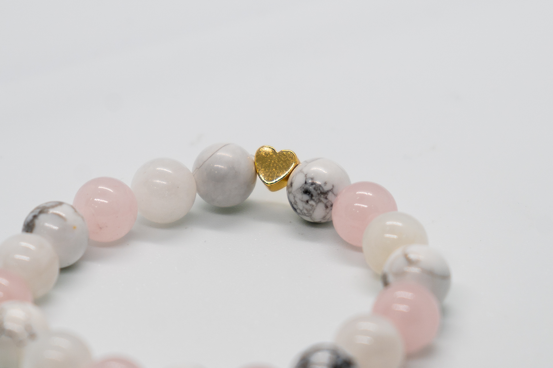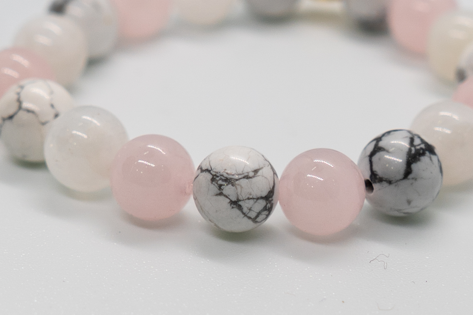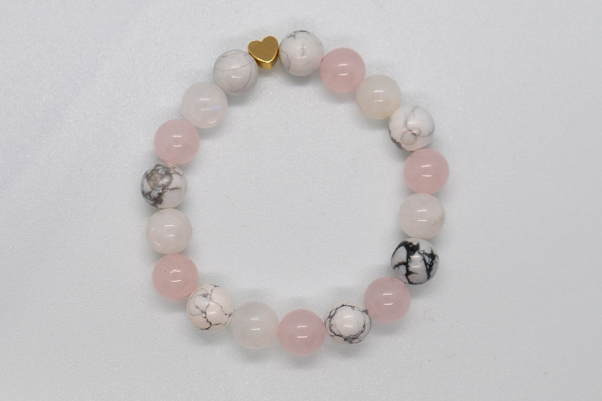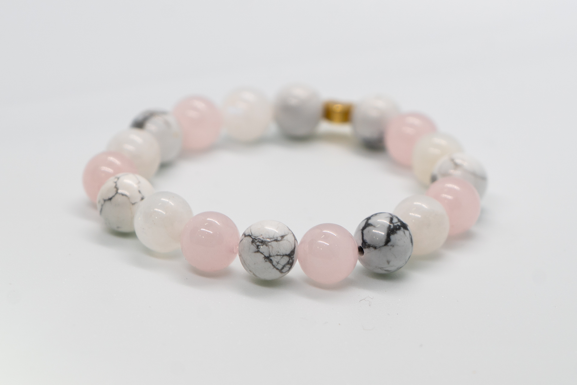 Esta pulsera está diseñada para fortalecer el amor en todas sus formas, combinando la energía femenina y protectora de la piedra luna, la ternura y armonía del cuarzo rosa, y la calma y paciencia que aporta la howlita blanca.